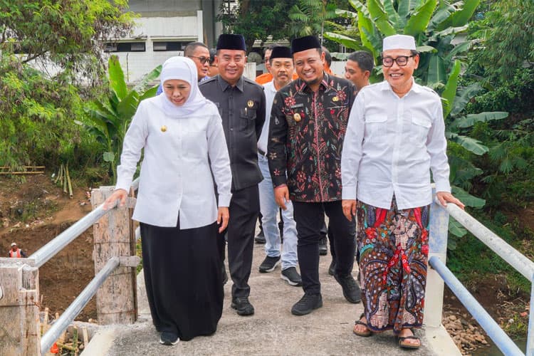 Surabaya – Gubernur Jawa Timur (Jatim) Khofifah Indar Parawansa meninjau rekonstruksi jembatan yang menghubungkan Pondok Putri Hafshawaty Zainul Hasan Genggong di Desa Temenggungan Kecamatan Krejengan ke SMK Zainul Hasan dan Pondok Putra Hafshawaty di Desa Karangbong, Kecamatan Pajarakan Kabupaten Probolinggo, Kamis (19/6/2025).