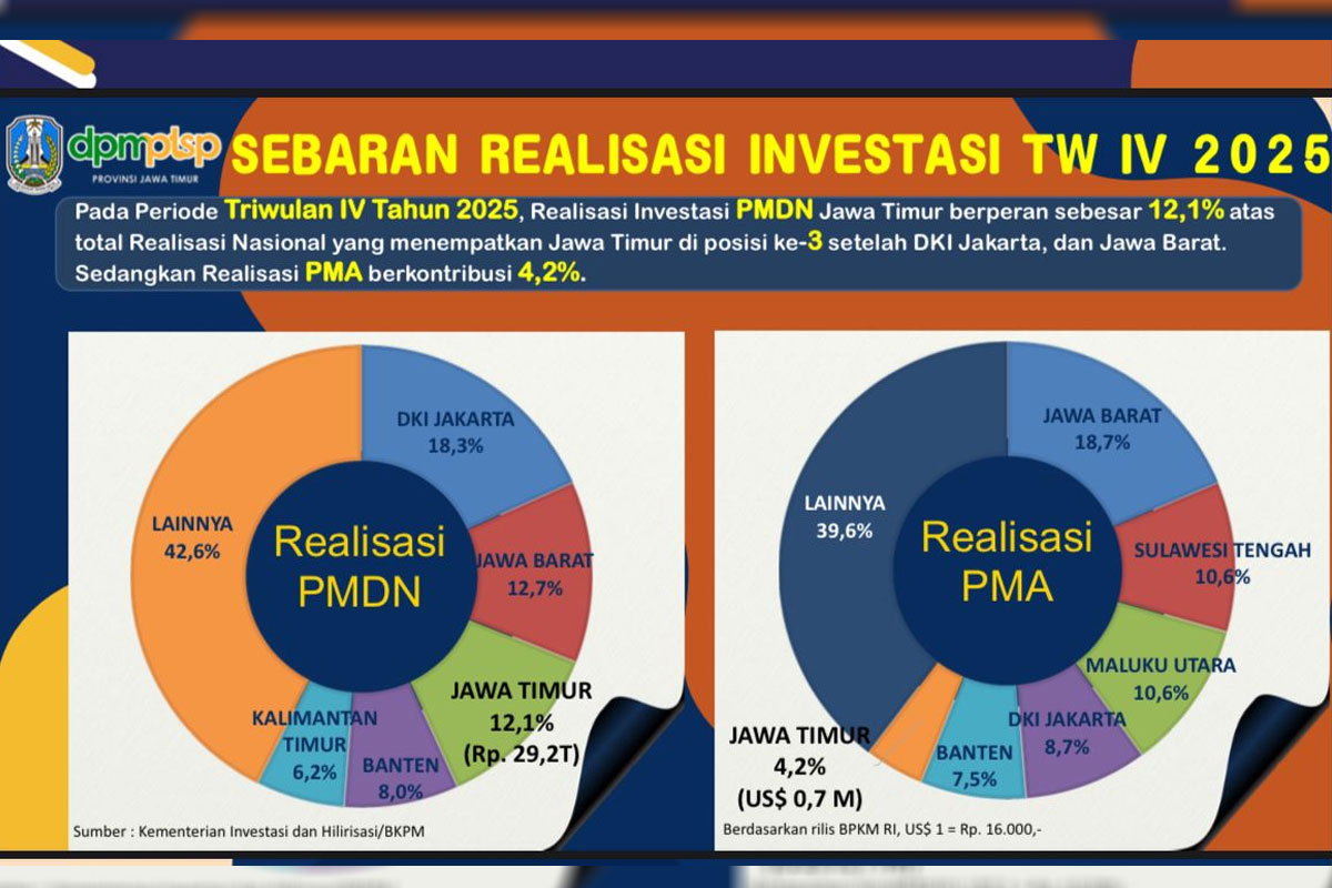 Dinas Penanaman Modal dan Pelayanan Terpadu Satu Pintu (DPMPTSP) Jatim mencatat adanya lonjakan tajam dalam realisasi modal asing (PMA) maupun dalam negeri (PMDN) selama lima tahun terakhir. Pada 2025, total investasi mencapai Rp147,7 triliun, tumbuh 0,3 persen dibandingkan tahun sebelumnya.