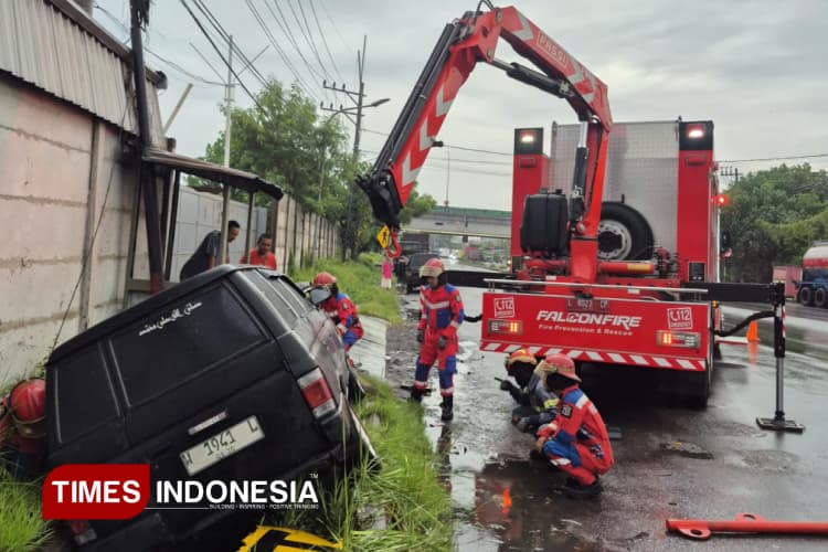 Surabaya – Mobil Panther warna hitam terperosok ke dalam saluran air, kondisi pengemudi mengalami patah tulang.