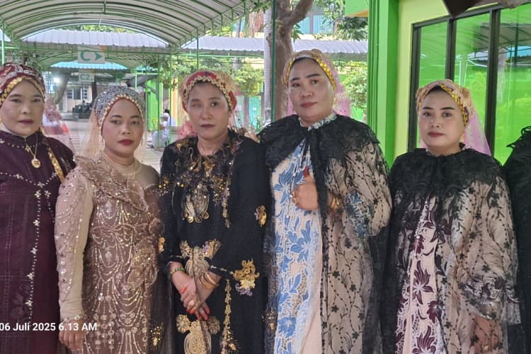 Surabaya – Suasana pada Minggu (6/7/2025) pagi di Asrama Haji Surabaya tampak semarak dengan pemandangan para wanita memakai semacam gaun pesta dengan hiasan manik-manik dan payet emas.
