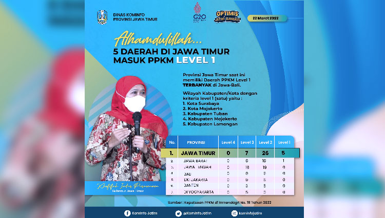 SURABAYA – Penanganan pandemi Covid-19 Jatim terus menunjukkan progres yang positif. Berdasarkan Instruksi Menteri Dalam Negeri Nomor 17 Tahun 2022 yang terbit 21 Maret 2022, berlaku tanggal 22 Maret sampai 4 April 2022, sejumlah daerah yang ditetapkan berstatus PPKM Level 1 meningkat.